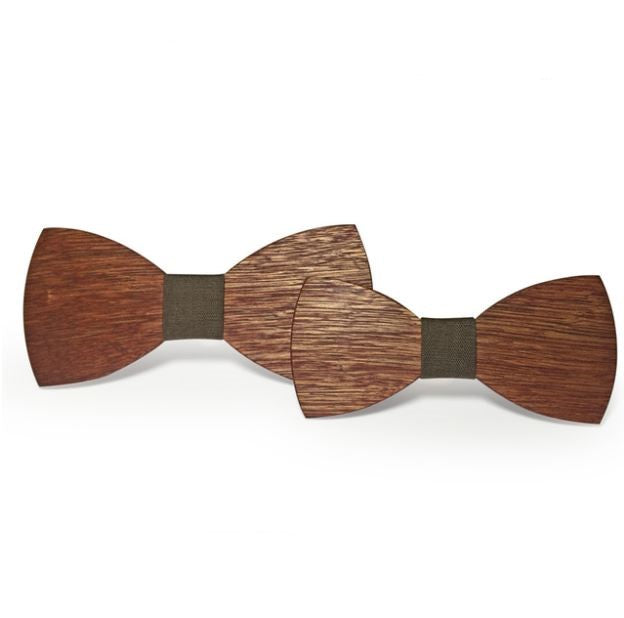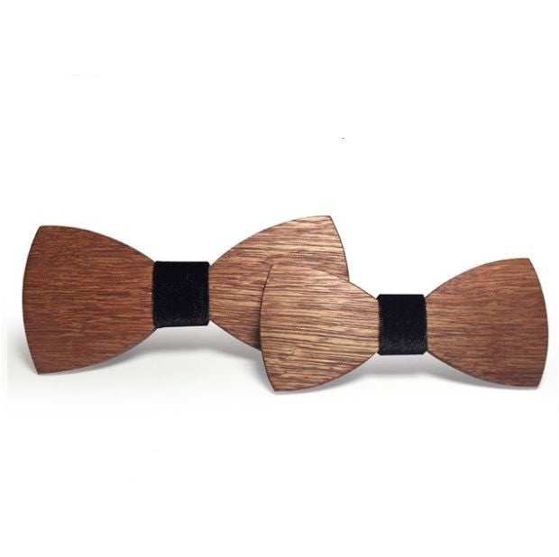 Add a little flair in your next work party, wedding, or fundraiser event with a classic 100% wood bow tie.  Handcrafted of bamboo, each tie is unique and features a handmade cotton fabric centerpiece and black elastic band with clasp.  Kids combo includes two ties: one adult size and one kids size.