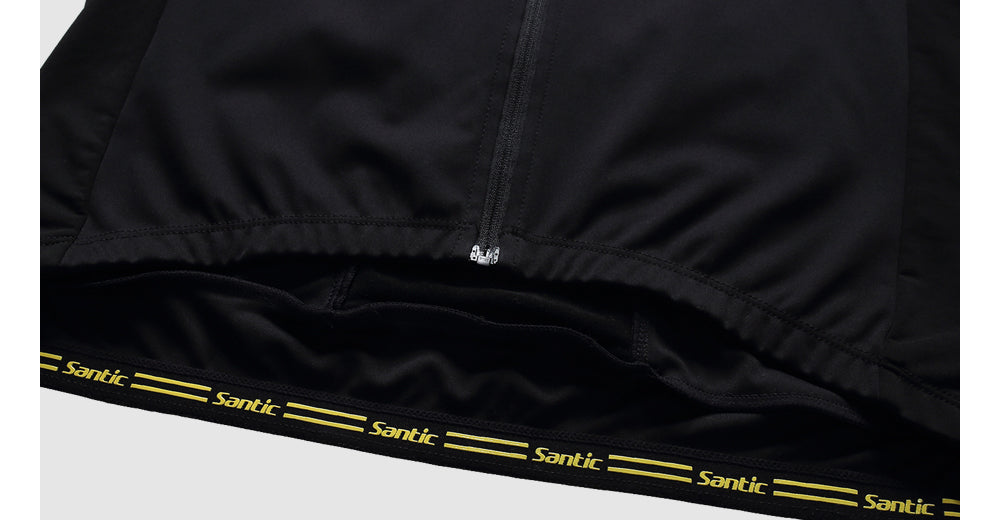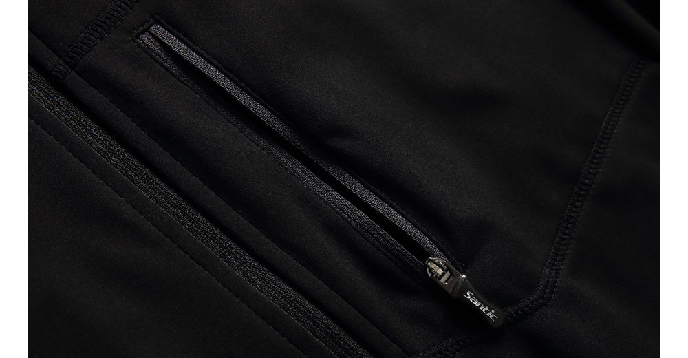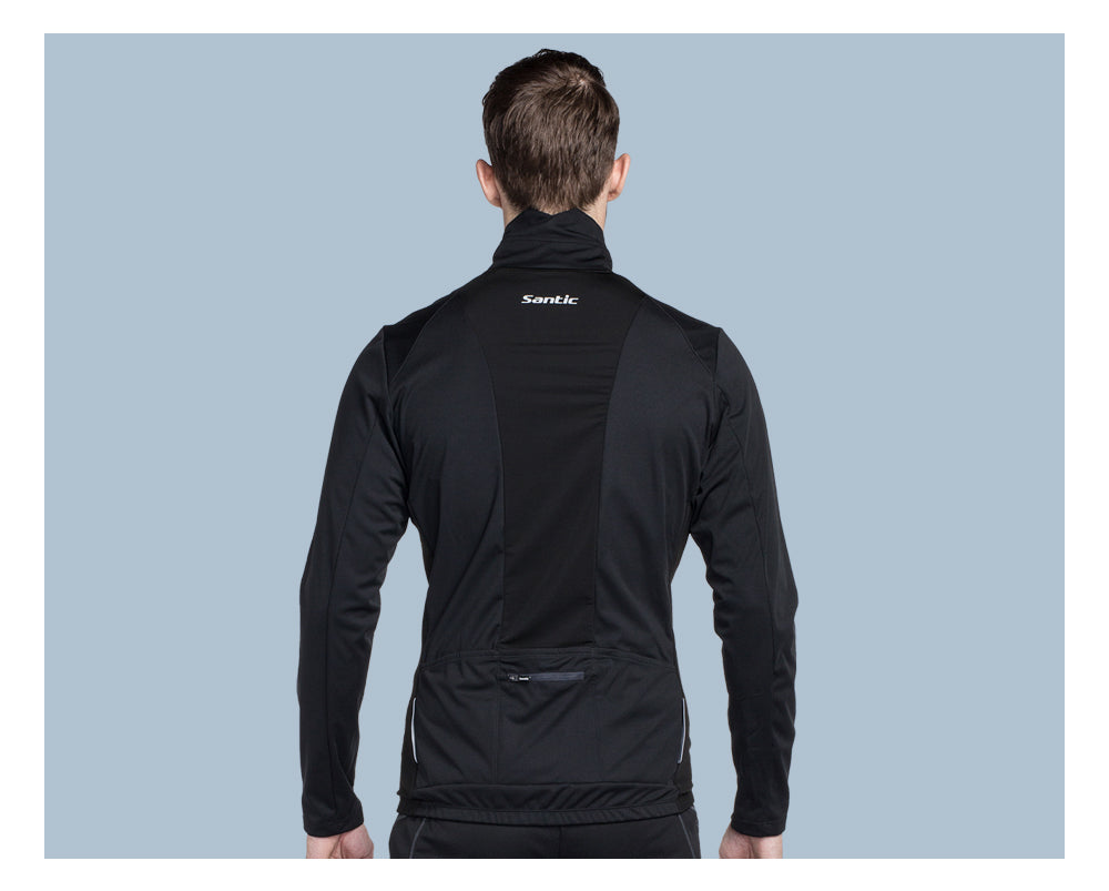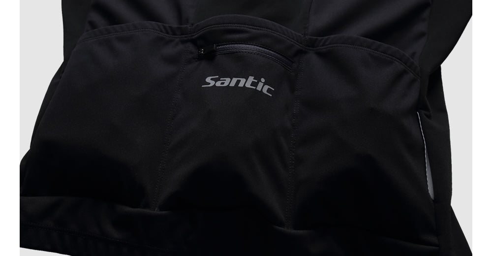 Features Santic's UV Shield technology, small front zipper pocket, three rear pockets, small rear zipper pocket, and reflective details on the sides.