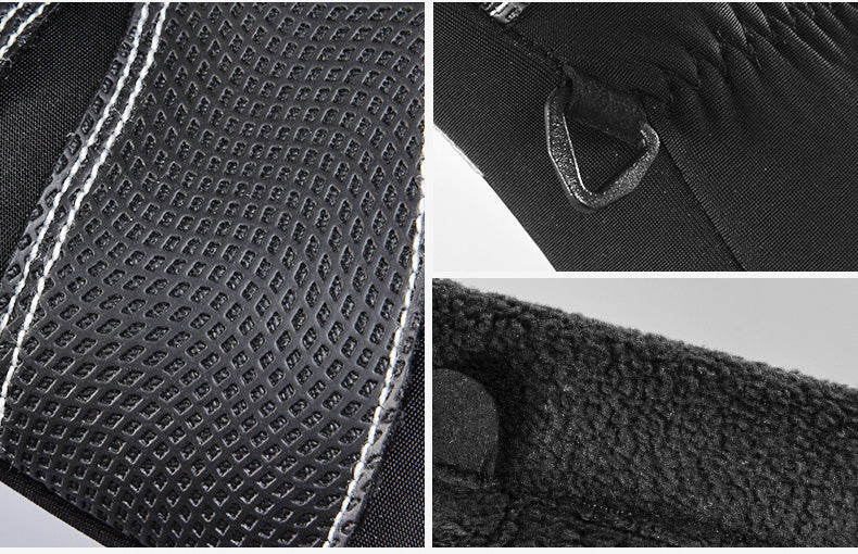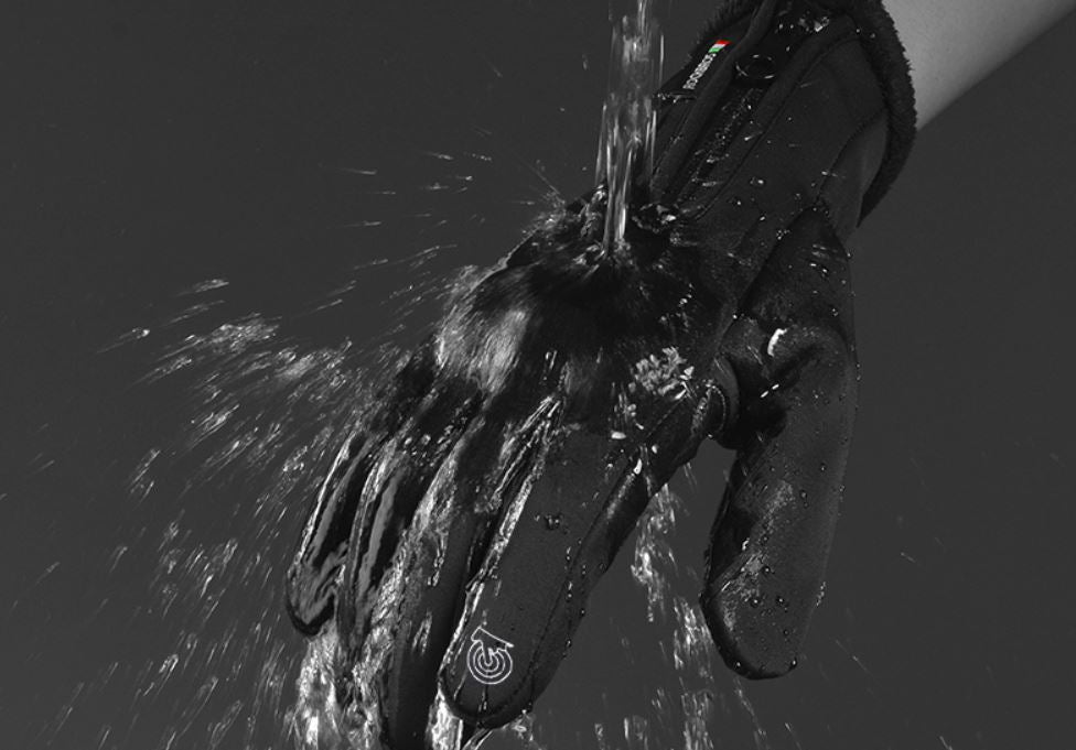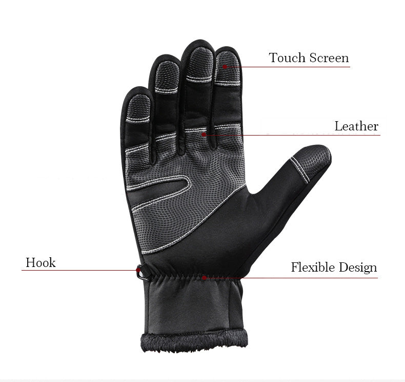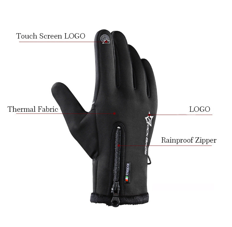 Winter thermal cycling gloves that are wind-resistant, water-resistant, and anti-slip.  Designed with touch screen sensitivity, so you can use your phone without taking them off.  Fleece interior with water-resistant neoprene shell.  Three available colors.  Unisex.  Made by Rockbros.