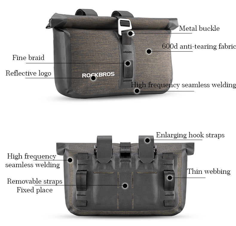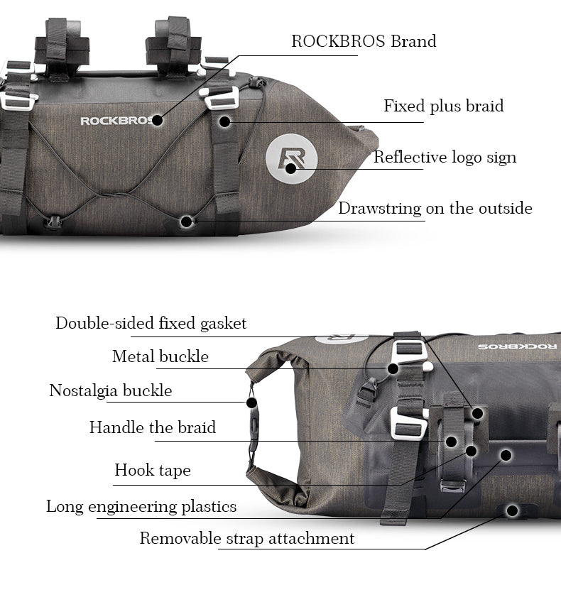 Perfect for any long distance trek or bicycle touring adventure, these premium handlebar panniers feature a rainproof anti-tear exterior nylon shell, high frequency seamless welding, ample hooks, drawstrings and velcro strapping, and reflective design. Duffelbag features unique roll design for water resistance.