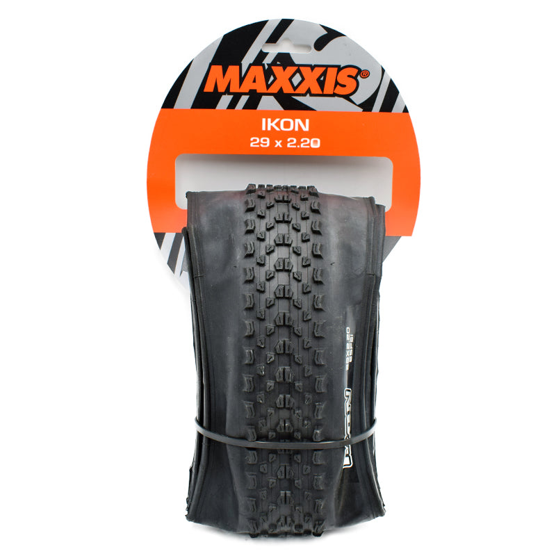 Award-winning Maxxis IKON mountain bike tire for use with tubes.  Unique tread pattern offers reduced rolling resistance without sacrificing grip.  Maximum recommended tire pressure 60 PSI.  Thread density 120 TPI.