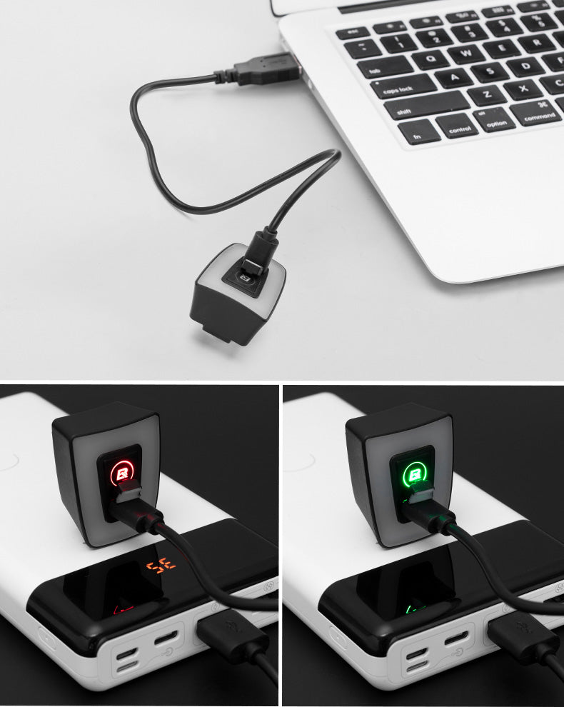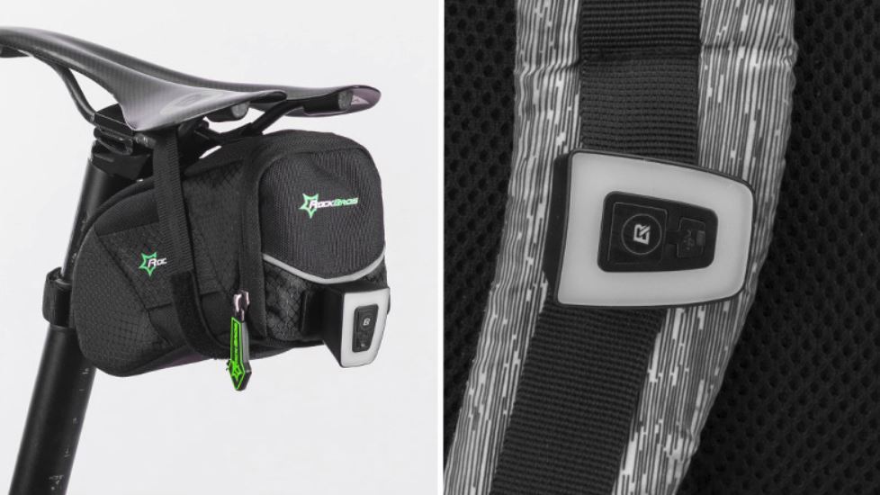 Features waterproof housing, USB port with charging indicator lights, and a USB cord.  Contains one rechargeable lithium battery.  Made by Rockbros.